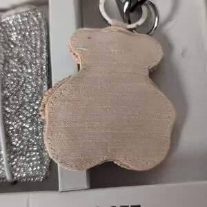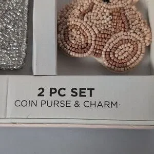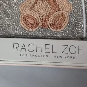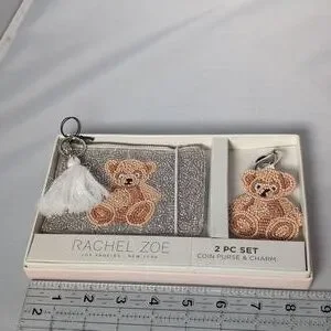 Rachel Zoe Beaded Teddy Bear 2 Piece Coin Purse & Bag Charm. Tan, silver, and cream colored. Coin purse has zipper closure. New in original packaging but does not have a tag. Has not been removed from the box. Box does have a lid.