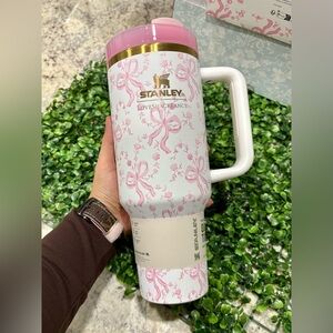 Charming Stanley tumbler with pink bow design. Comes with matching box straw topper and cloth
