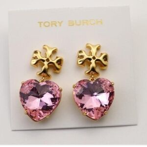 Nwt Tory Burch pink heart crystal Elegant gold earrings featuring stunning pink heart-shaped stones. Perfect for adding a touch of glamour to any outfit.