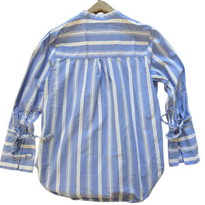 Color/Pattern: Blue and white vertical stripes: style: coastal business casual top; Button-down, collared (band collar), with unique cinched or tie cuffs on the long sleeves