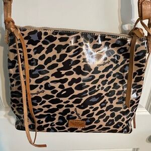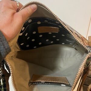 Consuela crossbody with leopard print and teal embroidery accents; has polka dots inside! Some water marks on bottom of bag, which can likely be removed with leather cleaner, and signs of normal use inside (see pics). Still in great shape.