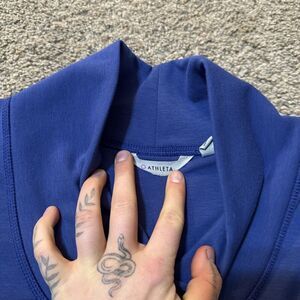 This Athleta Cozy Karma Sweatshirt Dress Tunic in Blue is perfect for casual occasions. The dress features a V-neckline, long sleeves, and a pullover closure. The oversized tunic style dress is made of a combination of polyester, cotton, and spandex, with a fleece lining for added warmth. It is machine washable for easy care. The dress is XXS in size but fits like a small and has a knee-length hemline. The solid pattern and stretch fabric make it a comfortable and stylish choice for any woman.