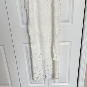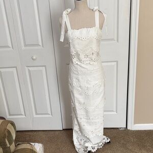 Elegant white maxi dress. Features floral cut-out design. Adjustable shoulder ties. Perfect for special occasions.