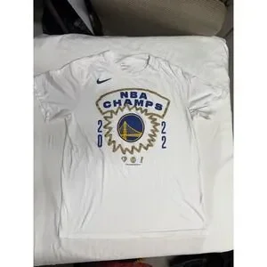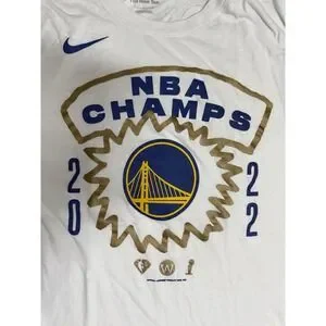 The Nike Golden State Warriors 2022 NBA Champs White T-Shirt is a men's size Large shirt that features a graphic print design with the Warriors logo. Made from a comfortable blend of polyester and cotton, this regular fit shirt is machine washable and perfect for all seasons. The shirt is ideal for fans of the Golden State Warriors, showcasing their championship status and representing the team in style.