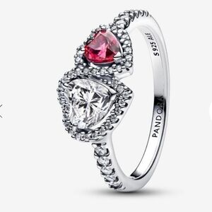 An eye-catching statement of love. This ring showcases two heart-cut stones, one clear cubic zirconia and one vibrant red man-made crystal, connected by a halo of shimmering pavé. Crafted in sterling silver, the top half of the band is adorned with more sparkling stones, creating a radiant effect. Pair it with other sterling silver rings for a love-filled stack, or let it shine as a standalone statement. Inspired by the love that connects us, the two hearts symbolize harmony and unwavering support between two souls.