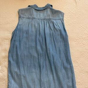 Chic sleeveless denim dress with button-down front. Features chest pockets for added style.