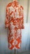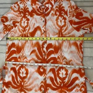 Stylish dress with a vibrant orange and white pattern. Features a button-up front and a matching belt.