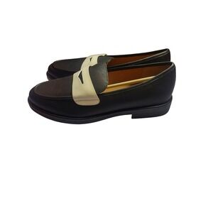 Gentle Souls by Kenneth Cole Cybil loafers in black leather with a contrasting cream-colored penny strap. These sophisticated slip-ons feature a classic almond toe and a low block heel for all-day comfort. Crafted with premium leather uppers and a cushioned footbed, they offer a refined look suitable for both professional and casual settings. The durable rubber outsole provides traction and stability.