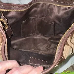 Elegant Coach hobo bag with signature pattern. Features tan and brown tones. Perfect for everyday use. Some wear on the piping, please see pictures.