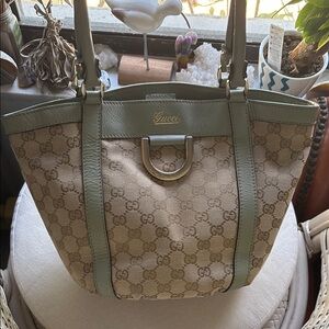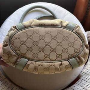 SOLD • Gucci GG Monogram Fabric Cream Sage Mint Green Leather Bucket Shoulder