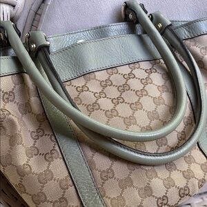 This adorable Gucci shoulder bag showcases the classic cream and brown GG monogram pattern and features a rare sage mint green color palette. The structured design with an oval bottom and double handles offer both style and practicality, making it an ideal choice for everyday use.