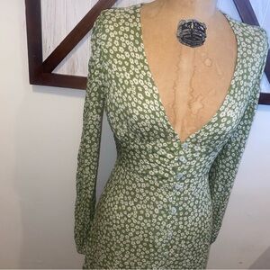 Chic long sleeve dress with a deep V-neck. Features a stylish green pattern. Perfect for versatile wear. this measures 17 inches pit to pit.
