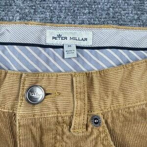 Pre-owned Peter Millar corduroy pants with light general wear and wrinkling from storage. Fabric, zipper, button, belt loops, pockets, and hems are clean and intact without stains, holes, or fraying. Interior brand and size labels are legible; original retail hang tags or additional packaging are not included.