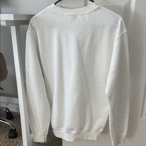 Chic white sweatshirt. Features blue bow pattern. Cozy and stylish. Great condition - unnoticeable amount of white pilling but otherwise looks brand new. Smoke free