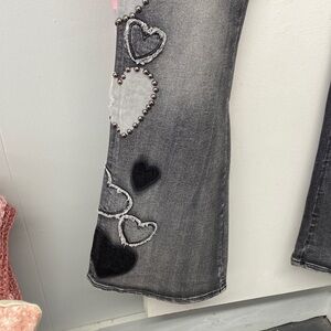 Stylish boot cut jeans with heart patterns. Features a blend of gray tones. Perfect for casual wear.