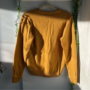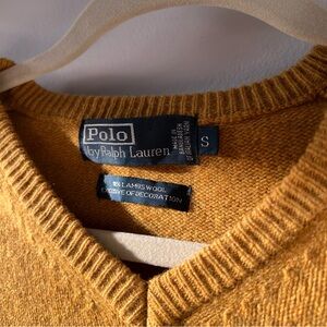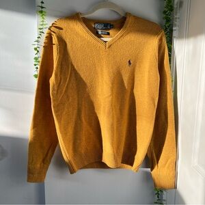 Stylish V-neck sweater by Polo Ralph Lauren. Vibrant mustard yellow color. Perfect for any occasion to keep you warm. No stains, holes, or discolouration Measured flat: Pit to pit 19” Length 24” Feel free to ask questions