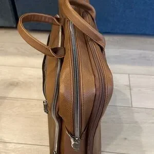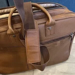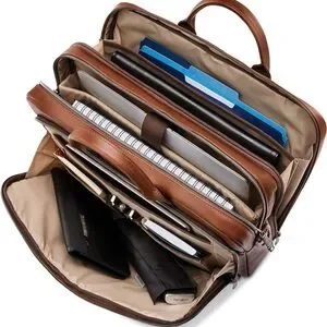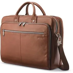 Elegant Samsonite briefcase in tan leather. Features multiple compartments and sturdy handles. Perfect for business use. Small tear on side. Still has lots of life!