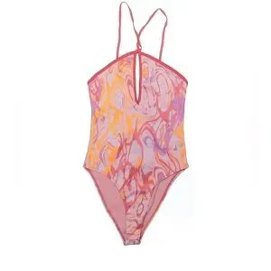 Bold and eye-catching Zara retro swirl bodysuit, new with tags. This statement piece features a vibrant pink and orange abstract print with a flattering halter neckline and keyhole detail—perfect for summer, festivals, or a night out.