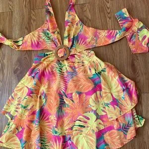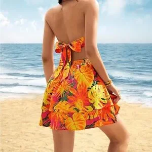 Embrace summer vibes with this vibrant tropical halter neck dress. Perfect for beach outings and sunny days.