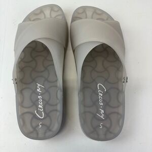 Description: Circus by Sam Edelman Jaylee women's size 5M jelly slides in silver featuring translucent PVC upper with wide crisscross straps. Almond-toe slip-on design with cushioned insole provides comfort for poolside or casual wear. 1/2" platform with manmade lining and sole. Fresh jelly sandal styling offers easy summer footwear option.