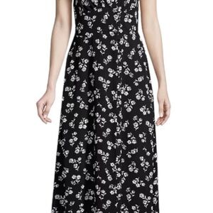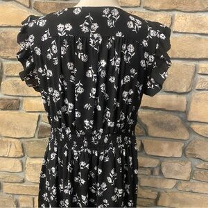 This is a beautiful Kate Spade dandelion floral maxi dress called Nerissa. It is black and white with a V-neck and cap ruffle sleeves. Down the stomach and hip area is a row of small beautiful fabric buttons. I try to show this in the video. On the backside of the waist there’s about a good 2 inches of stretchy elastic that’s only on the back. It is lightweight and very comfortable. *As you can see in the pictures, there is a black marker line through the label. This is to prevent store returns on last sale items. I have the measurements in the pictures, but there is a lot of extra room in the pit to pit measurement. For reference the mannequin is a size 6.