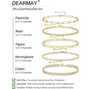 Chic 14K Gold Plated Bracelets Set: Set includes Figaro Bracelets, Cuban link Bracelets, Herringbone Bracelets, Paperclip Bracelets, and Rope Bracelets. Suitable for layering or solo display.