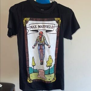 Black tee with vibrant graphic. Features unique design. Casual and trendy. Max stranger things