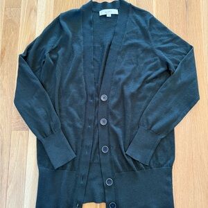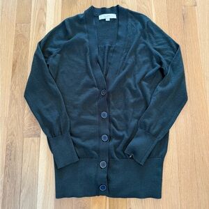 Elegant charcoal cardigan by LOFT. Features a button-up front and ribbed detailing.