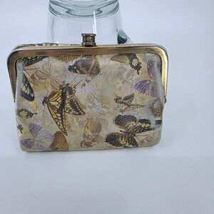 Add a touch of whimsical vintage charm to your accessories with this rare Hobo International frame wallet. Crafted from metallic gold-tone leather, it features a beautiful, detailed print of Monarch and Swallowtail butterflies.