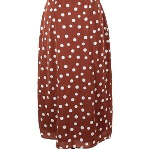 Chic rust midi skirt with white polka dots. Ideal for versatile styling.