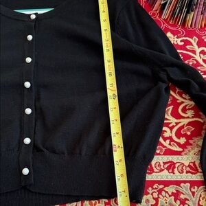 Chic black cardigan featuring elegant pearl buttons. Ideal for versatile styling.