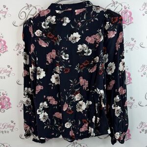 RW&CO. Long sleeve shirt, flowers, blue red light, pink, Navy Floral Blouse