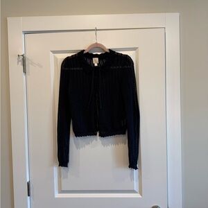 Sold out style. Navy blue cardigan with lace/crochet pattern. Cute collar and tie up front detail. Can be styled different ways, great for layering!