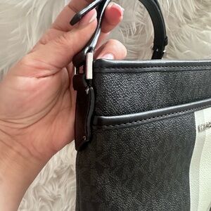 Elegant Michael Kors crossbody with a black body and cream stripe. Perfect for everyday use.