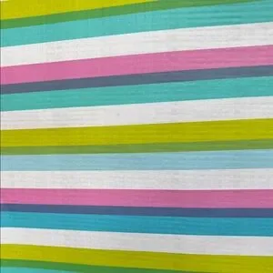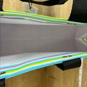 Colorful tote with bold stripes. Features pink, blue, and green hues. Ideal for everyday use.