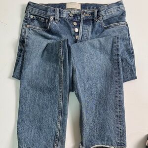 Everlane button fly, mid rise straight leg jeans. Size E4 short equivalent to Sz 6/8. Inseam 28 inches.