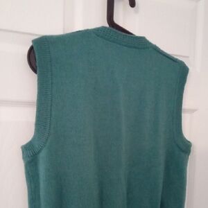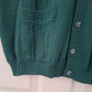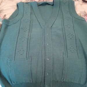 Stay cozy and stylish with this turquoise green V-Neckline Sweater Vest with Button Front. Featuring ribbed detailing and floral flourishes in pattern. Clear Acrylic floral buttons. Front pockets with ribbed edging. Perfect for layering in any season. New condition, maybe handmade.
