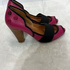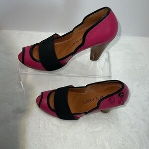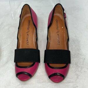Opposites attract Spencer pink and black slip on heels. Size 6.5. Some peeling on the inside foot bed of the left shoe see picture. EUC.