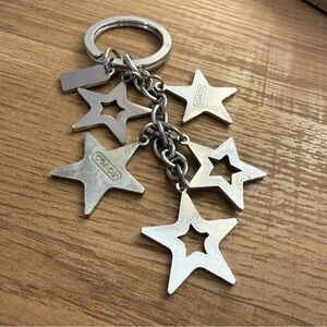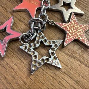 Authentic Coach multi-star charm keychain featuring pink enamel stars, silver-tone metal star cutouts, Coach logo tag, and a rhinestone-accent star. Super cute as a bag charm, purse accessory, or key ring.