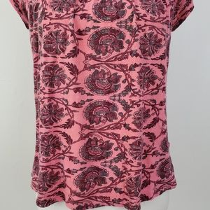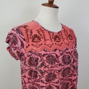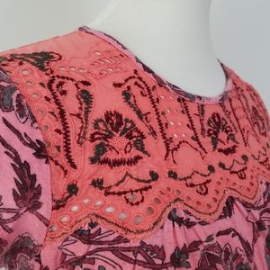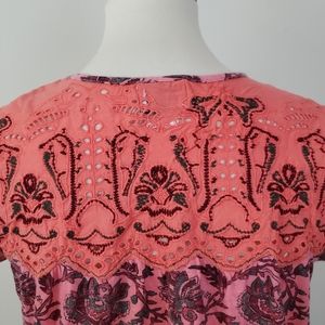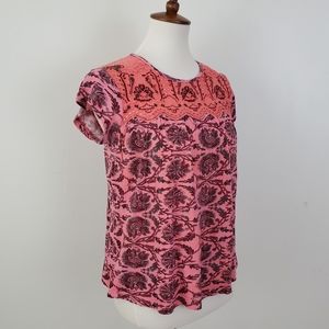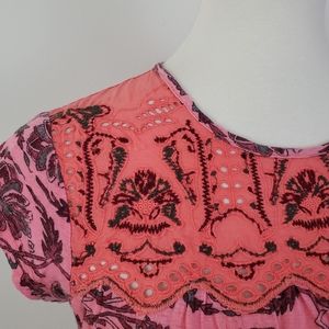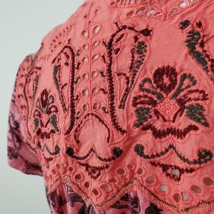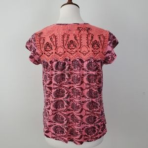Postmark Penelope Printed Top from Anthropologie. Embroidered details and eyelet cutouts on yoke. Short sleeves. Only worn a couple times. Excellent condition! Size Small
