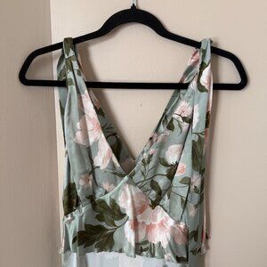 The Reformation photo looks almost blue, but the dress is decidedly green with pink and white florals. I typically wear sizes 10 or 12 and found this XL to be a good fit. Reformation's size guide says an XL is equivalent to a size 12, Chest: 41.5", Waist: 33.5", Hip: 44.5"