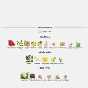 Crab apple, Blue chamomile, Ylang ylang, Pear, Tuberose, Oakmoss, Cognac oil, Brown-eyed rock rose, Ho wood, Ambrette seed, Ginger root, Pink peppercorn, Lemon rind, Jasmine gonciflorum, Peppermint, Red cedar, Olibanum resinoid, Petitgrain, Neroli, Bergamot rind, Benzoin Asian