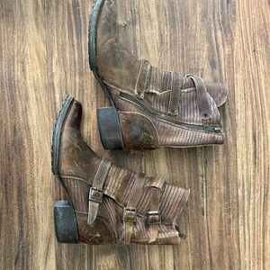 Rugged brown boots with textured straps. Honestly a little heartbroken these don’t fit anymore. They’ve had a lot of wear but they still have life in them - they do have a distressed look and more so from being worn. Open to offers to a home that will get a ton of use out of them!!