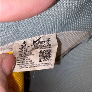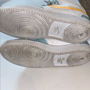 Nike mens sneakers with a bold yellow swoosh. White base with light blue accents