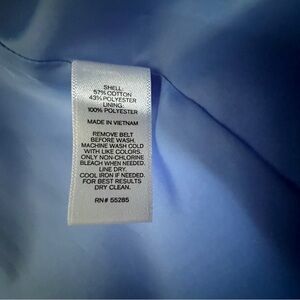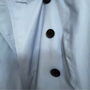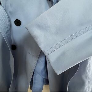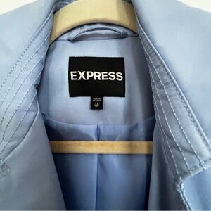 Chic and elegant light blue trench coat by Express. Features double-breasted design and matching belt. Ideal for layering.