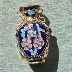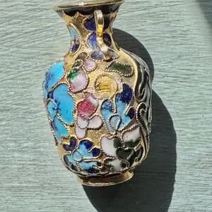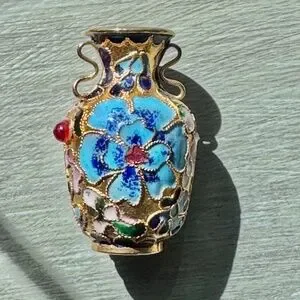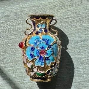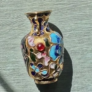 Vintage Cloisonne Miniature Vase Gold Trim. Colorful Decorative Collector Item likely produced in China in the mid 1900s. It is in mint condition, 3 inches tall, 2” wide with a mouth opening of 1 inch. No dents or cracks, no signs of oxidation. The narrow vase has a rust colored gem at the top. See photos. In great condition.