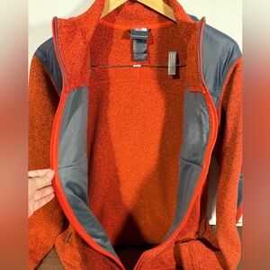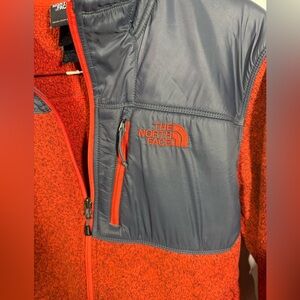 Men’s size large sweater fleece by The North Face. Very nice preowned condition, all zippers are in tact and working. Orange heathered sweater fleece with grey detail.