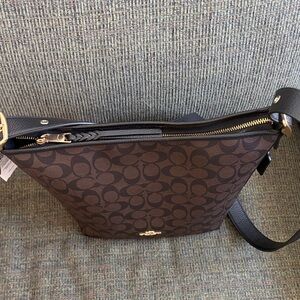 Stylish Coach crossbody bag with signature pattern. Dark brown color with elegant gold accents. Perfect for everyday use.