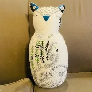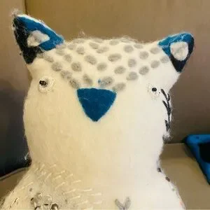 Beautiful and full of whimsy. 10% wool cat figurine pillow with embroidery and sequins. Has some pilling but great condition. Measures 20” tall and 11” at widest ,