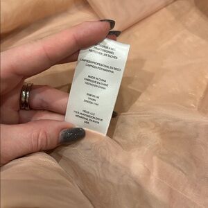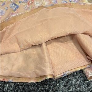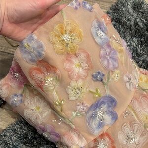 Absolutely show stopping nude strapless organza ankle length gown with elaborate pastel organza floral appliqué, bead and pear details. There is boning in the bust. Fully lined with a back hidden zipper. There is no stretch in the fabric.